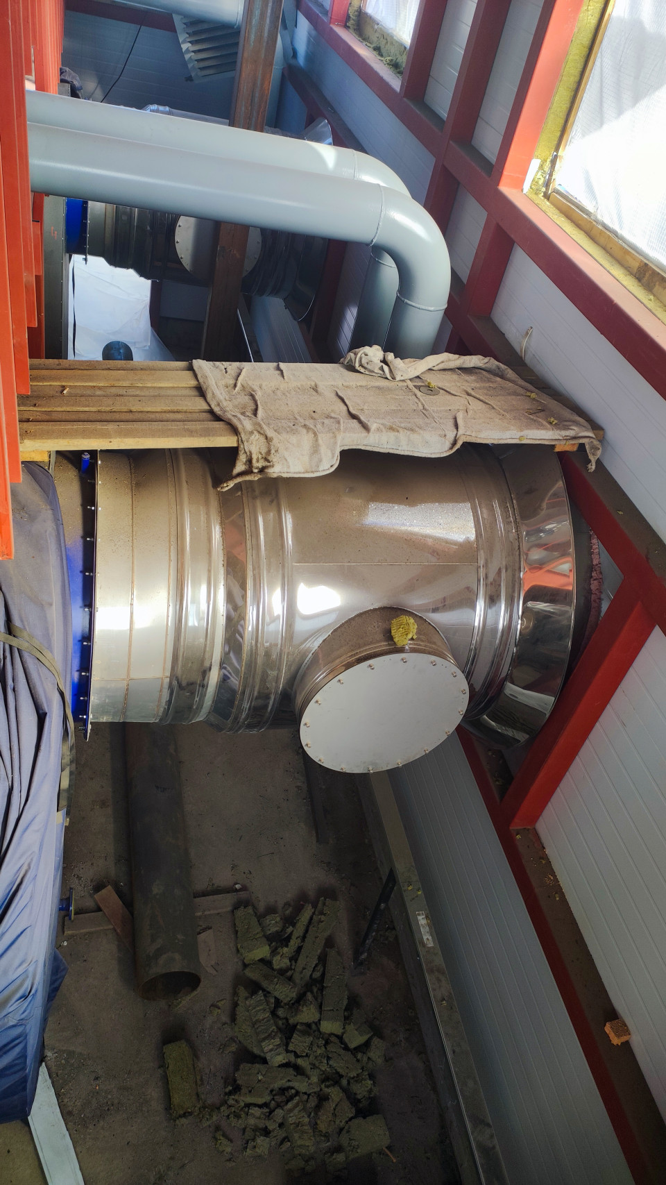 На фотографии изображён участок системы вентиляции или дымоудаления из нержавеющей стали, установленный в котельной. Воздуховод имеет крупный диаметр и соединён с трубопроводом через фланцы. На полу лежит изоляционный материал, что указывает на монтажные работы. Фото отражает процесс установки инженерных коммуникаций и может использоваться в строительной и технической документации.