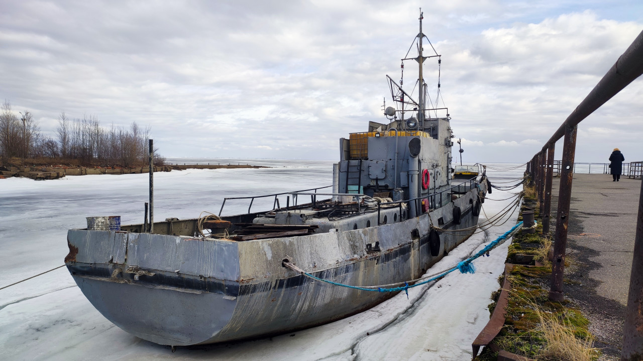 На снимке показано металлическое судно, стоящее у пирса и закреплённое канатами в замерзшей воде. Видны следы эксплуатации — облупившаяся краска, следы коррозии, оборудование на палубе. На заднем плане — деревья и просторная линия горизонта. Сцена снята в конце зимы при пасмурной погоде. Этот кадр можно использовать в материалах о промышленной эстетике, водном транспорте и инфраструктуре северных портов.