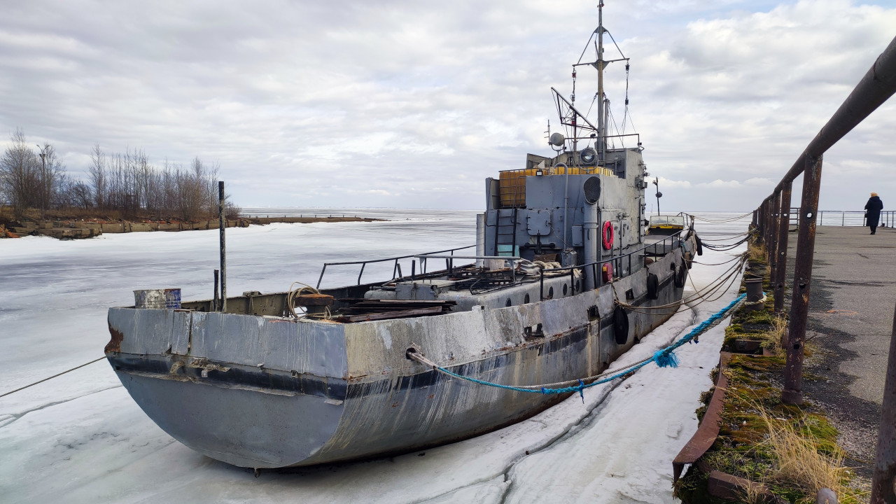 На фотографии изображено старое металлическое судно, пришвартованное у причала на фоне частично замерзшего залива. Корпус корабля покрыт следами коррозии и потёками краски, на палубе заметны остатки оборудования и тросы. Судя по конструкции, это малое служебное или техническое судно середины XX века, вероятно использовавшееся в прибрежных операциях. На заднем плане виднеются безлистные деревья и бетонные остатки старого пирса. Сцена снята зимой в северном порту России, подходит для тем военной истории, индустриального наследия и морского транспорта.