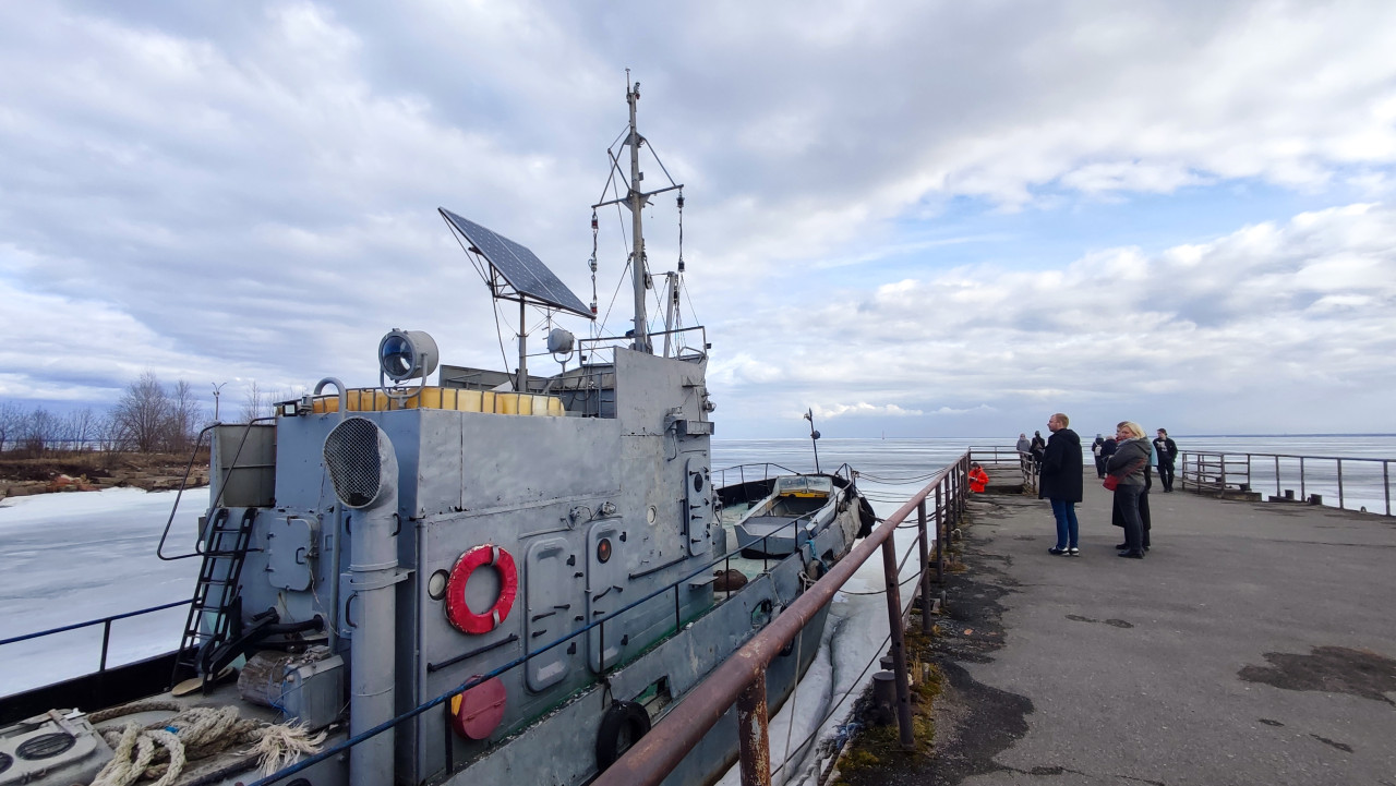 На фотографии изображено металлическое судно, пришвартованное у бетонного пирса, вдоль которого прогуливаются люди. Корабль окрашен в серый цвет, на палубе установлены прожекторы, антенны и солнечная панель, а на борту закреплён спасательный круг. Замерзшая акватория и зимняя одежда прохожих указывают на холодное время года. Сцена снята в северном прибрежном городе России, возможно на побережье Финского залива. Фото подходит для иллюстраций на темы морского транспорта, портовой инфраструктуры и прибрежной инженерии.