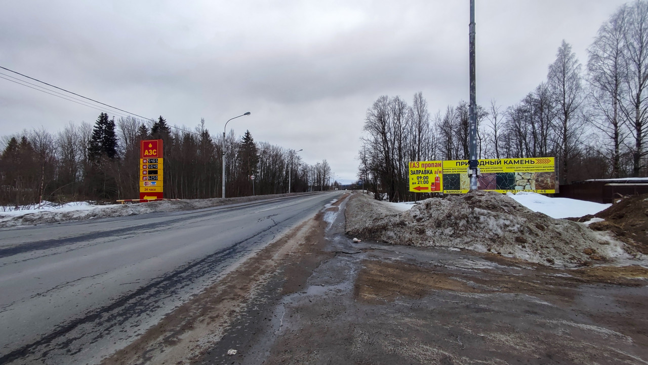 На снимке показана автозаправочная станция с ценами на топливо, расположенная вдоль загородной дороги. Рядом виден большой жёлтый баннер, рекламирующий газозаправку и продажу природного камня. Дорога мокрая, по обочинам лежит снег, небо затянуто облаками. Обстановка типична для конца зимы в северо-западных регионах России. Фотография может быть использована для материалов о транспортных маршрутах и дорожном сервисе.