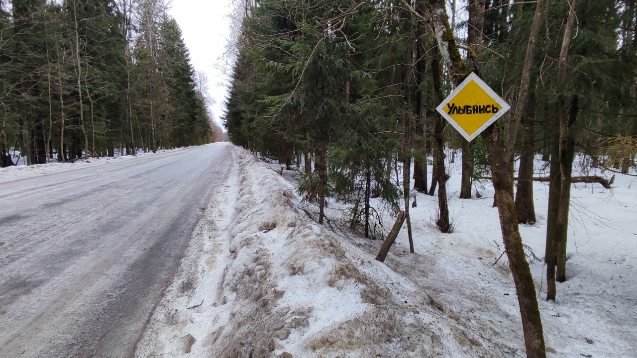 На фотографии изображена прямая заснеженная дорога, проходящая через густой хвойный лес. На переднем плане видно дерево с самодельным знаком «Улыбнись», выполненным в форме ромба с жёлтым фоном и чёрной надписью. По краю дороги заметны грязные снежные насыпи, типичные для конца зимы. Сцена передаёт атмосферу уединённого загородного маршрута в северном регионе России. Фото можно использовать для тематики путешествий, дорожных условий, позитивных инициатив и сельских пейзажей.