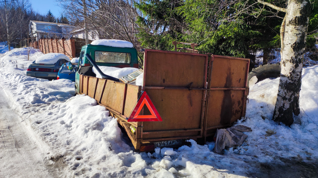 На фото запечатлен задний кузов грузовика с металлическими бортами и аварийным знаком, закрепленным на дверце. Кузов покрыт следами ржавчины, рядом снег и остатки мусора. Машина стоит неподвижно, что указывает на долгое неиспользование. Сцена типична для придорожной территории частного сектора в зимний сезон.