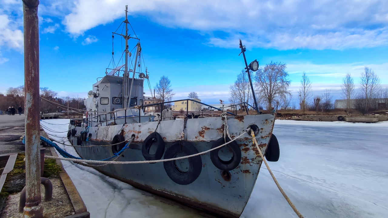 На снимке изображено старое техническое судно, пришвартованное у пирса на замерзшем водоёме. На корпусе видны следы ржавчины и потёки краски, а по борту прикреплены автомобильные шины, используемые как отбойники. На палубе расположены антенны, мачты и прожекторы. На заднем плане видны здания и деревья без листвы. Снимок отражает атмосферу северного индустриального порта и подходит для публикаций о судостроении, промышленной архитектуре и транспортной инфраструктуре.