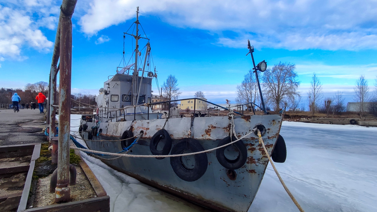На фотографии показано старое металлическое судно, стоящее во льду у бетонного пирса. Корпус корабля покрыт ржавчиной и тросами, вдоль борта висят шины-отбойники. На пирсе видны прохожие, одетые в зимнюю одежду, а на заднем плане — жилые и промышленные постройки. Яркое голубое небо контрастирует с холодным пейзажем. Снимок сделан в северном городе России и может быть использован для тем о морской инфраструктуре, зимних портах и инженерных сооружениях.