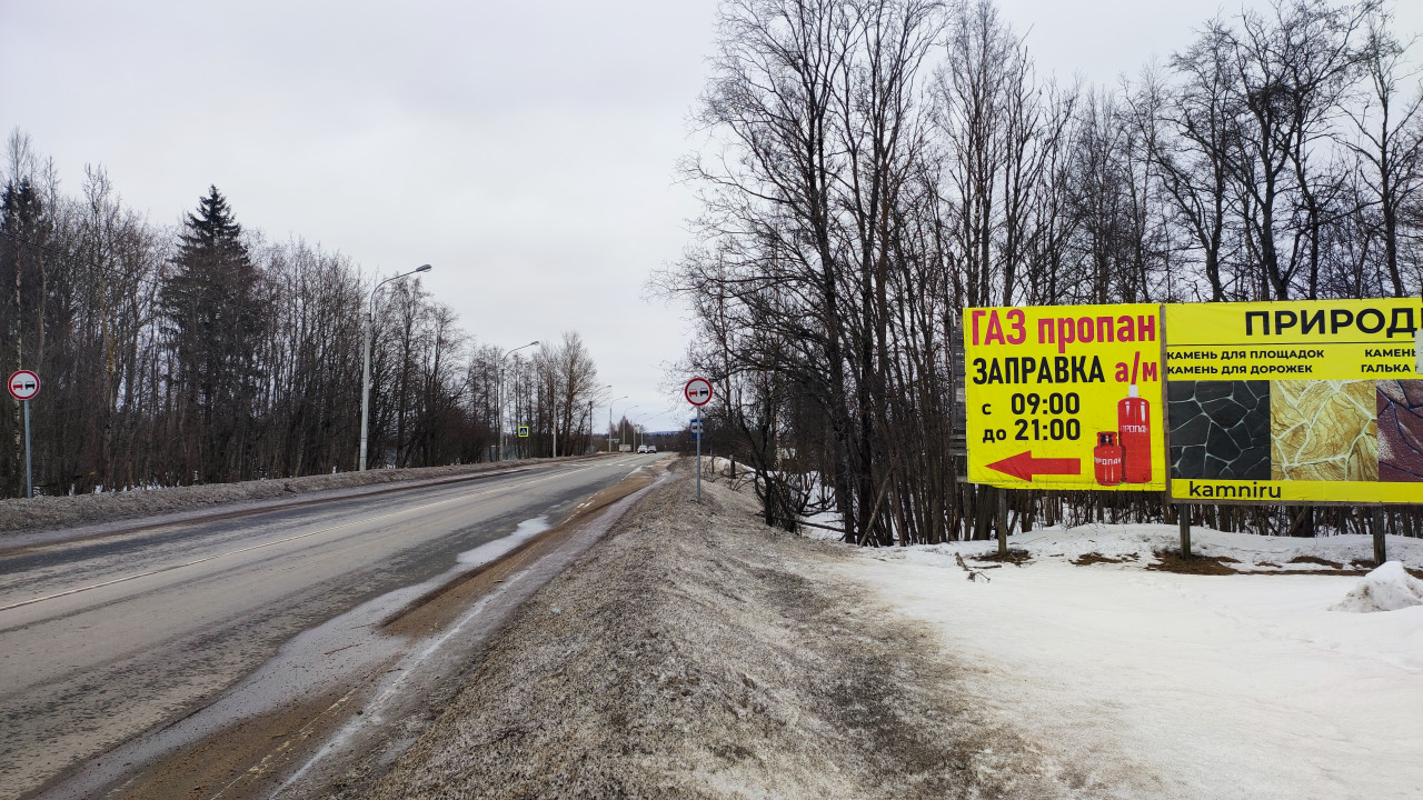 На фото изображён загородный участок дороги с рекламным баннером, сообщающим о продаже пропана и строительных материалов из природного камня. На заднем плане видны обочина, дорожные знаки и голые деревья. Дорога влажная, по краям лежит снег, небо пасмурное. Фото сделано в зимний период, вероятно, в Ленинградской области. Изображение подходит для иллюстрации тем транспортной инфраструктуры, наружной рекламы и загородных трасс России.
