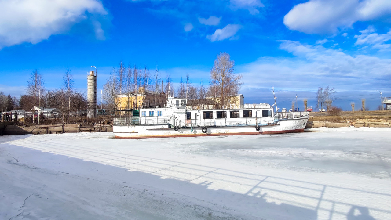 На фотографии изображено белое судно, застывшее во льду у берега. На заднем плане — желтые и кирпичные здания бывших промышленных построек, трубы и голые деревья. Широкий план позволяет рассмотреть ледяное покрытие и структуру берега. Снимок демонстрирует типичный вид портового района северного города в конце зимы. Кадр может использоваться для иллюстраций на тему судостроения, климата и индустриальной архитектуры.