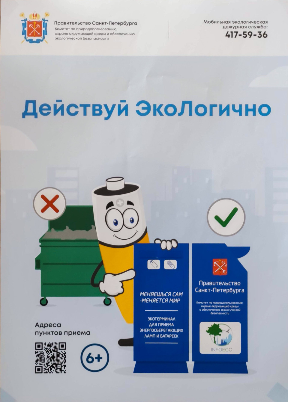На фотографии крупным планом запечатлен стендовый плакат экологической программы «Действуй ЭкоЛогично», дополненный изображением персонажа в виде батарейки, демонстрирующего правильный контейнер для приема опасных бытовых отходов. В верхней части присутствует герб и указание городского комитета по природопользованию Санкт-Петербурга, а также номер экологической дежурной службы. Плакат информирует жителей о правилах раздельного сбора и контактах пунктов приема, что делает его подходящим для публикаций об экологическом просвещении.