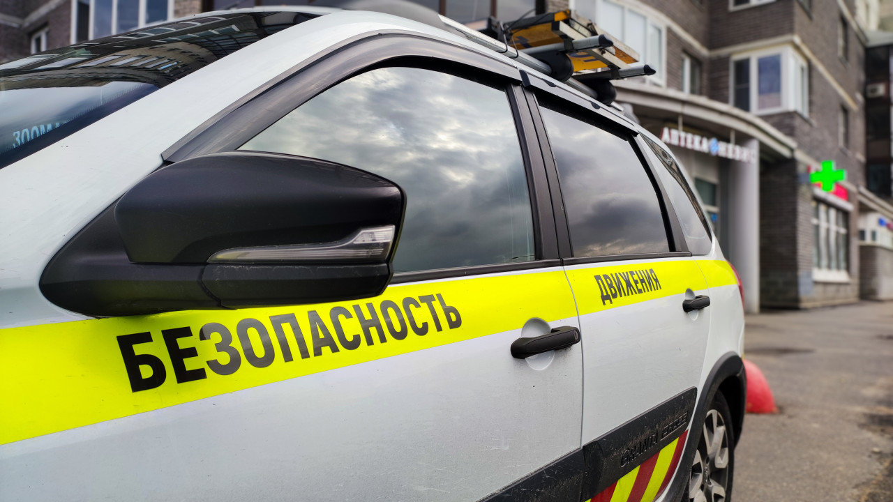 Автобус и кроссовер на многополосной дороге при наличии служебного авто у обочины