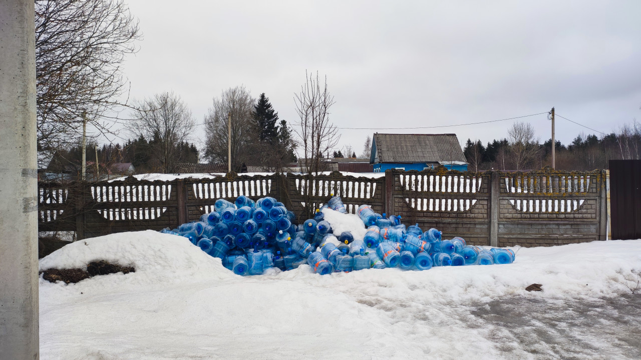 Пластиковые бутыли для воды, сложенные у частного забора
