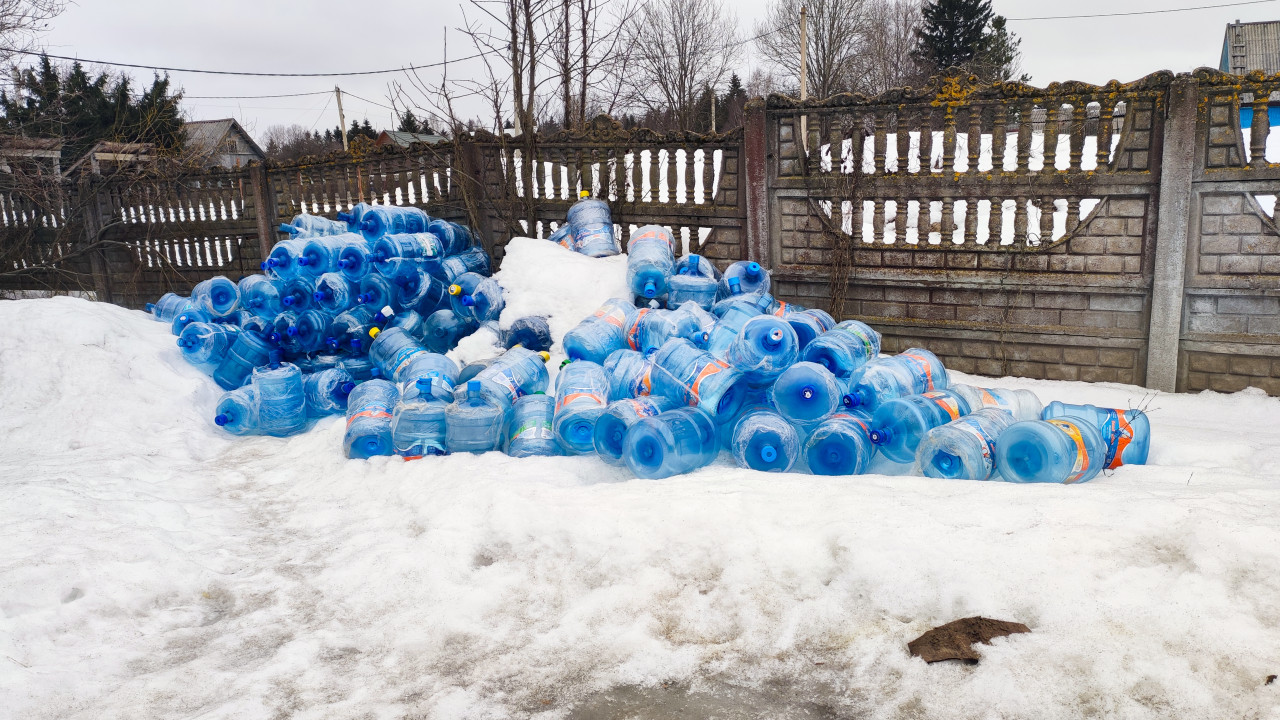 На фотографии изображена куча больших пластиковых бутылей для воды, лежащих на снегу возле старого бетонного забора в сельской местности. Судя по заснеженному ландшафту и безлистным деревьям, снимок сделан зимой, вероятно, в средней полосе России. Подобные емкости используются для доставки питьевой воды и часто повторно применяются. Фото может быть использовано в статьях о переработке пластика, экологии и бытовых отходах.