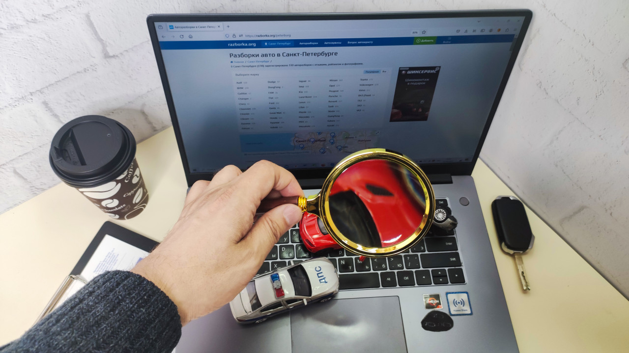 Лупа над ноутбуком с модельными автомобилями и сайтом авторазборки