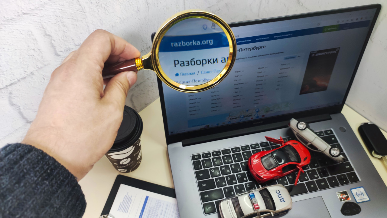 На изображении рука держит увеличительное стекло над экраном ноутбука Huawei, где открыт сайт razborka.org с разделом «Разборки авто в Санкт-Петербурге». На клавиатуре ноутбука размещены три игрушечные модели машин: полицейская, красная спортивная и перевернутая серебристая. Слева находится бумажный стакан с кофе и документы, справа — знак STOP и ключ от автомобиля. Фото снято в офисной среде и может использоваться для иллюстрации тем онлайн-поиска, проверки сервисов и автомобильных платформ.