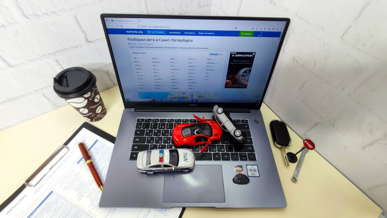 На фотографии ноутбук Huawei с открытым сайтом razborka.org, отображающим страницу «Разборки авто в Санкт-Петербурге». На клавиатуре размещены три игрушечных автомобиля: полицейская машина, красный спортивный автомобиль и перевернутая серебристая модель. Рядом на столе лежат ключ от автомобиля, гаечный ключ и знак STOP. Слева виден бумажный стакан с кофе и документы с ручкой на планшете. Снимок выполнен в офисной обстановке и подходит для иллюстрации тем, связанных с автомобильными сервисами и интернет-платформами.