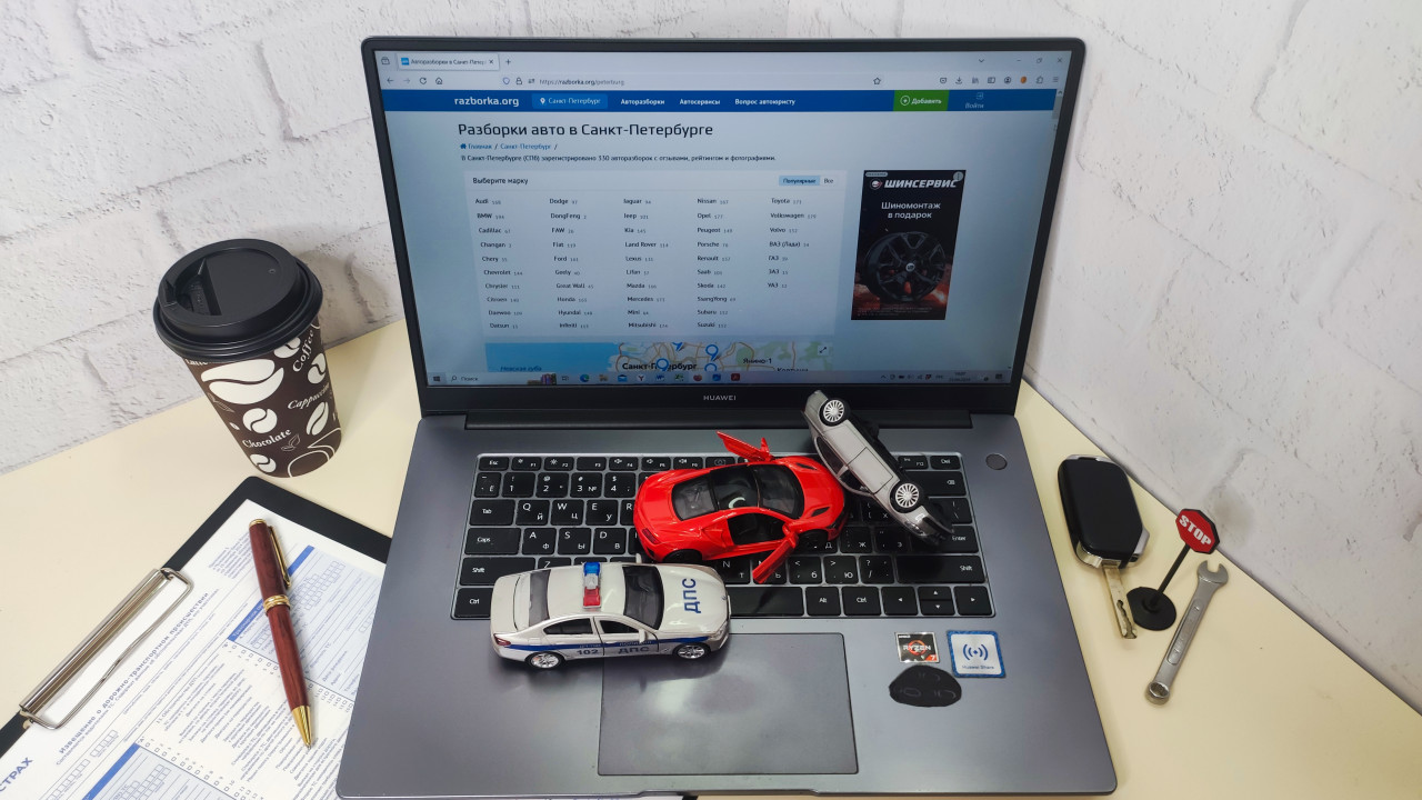 Изображён ноутбук Huawei, на экране которого открыт сайт razborka.org с информацией о разборках автомобилей в Санкт-Петербурге. На клавиатуре размещены три игрушечные машинки, изображающие дорожное происшествие: полицейская, красная и перевёрнутая серая. На столе лежат автоключ, миниатюрный знак «STOP», гаечный ключ, бумажные документы и кофейный стакан. Фон представлен белой кирпичной стеной. Фотография передаёт атмосферу работы с автомобильными темами, подходит для статей о ремонте и страховании машин.