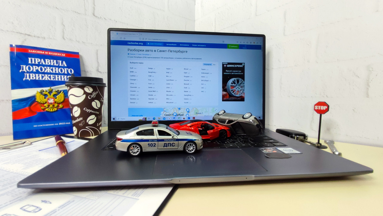 На фото изображён стол с ноутбуком Huawei, на экране которого открыт сайт razborka.org о разборках автомобилей в Санкт-Петербурге. На клавиатуре находятся три модельные машины — полицейская, красная и перевёрнутая серая, символизирующие дорожно-транспортное происшествие. Слева размещены книга «Правила дорожного движения» с гербом России, стакан кофе, документы и ручка. Справа — ключ от автомобиля, миниатюрный знак «STOP» и гаечный ключ. Фотография может использоваться для статей об обучении водителей, страховании и автомобильных авариях.