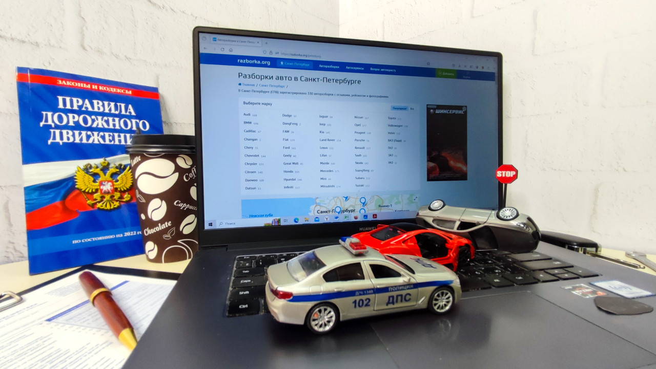 На фото изображён ноутбук Huawei с открытым сайтом razborka.org, посвящённым автомобильным разборкам в Санкт-Петербурге. На клавиатуре расположены три модельные машины, изображающие ДТП. Слева находятся книга «Правила дорожного движения» с гербом России, стакан кофе и страховые документы с ручкой. На заднем плане — белая кирпичная стена. Справа стоят автоключ, гаечный ключ и миниатюрный знак «STOP». Сцена используется для иллюстрации автомобильных тем: аварии, обучение, страхование и ремонт.