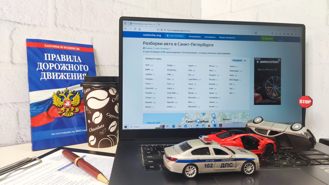 На снимке показан ноутбук Huawei, на котором открыт сайт razborka.org, посвящённый автомобильным разборкам в Санкт-Петербурге. На клавиатуре расположены три модельные машины — полицейская, красная и перевёрнутая серая, изображающие аварию. Слева находятся книга «Правила дорожного движения» с гербом России, кофейный стакан и документы на страховом бланке. Справа видны ключ от автомобиля, миниатюрный знак «STOP» и гаечный ключ. Фото отражает тему обучения вождению, автострахования и дорожной безопасности.