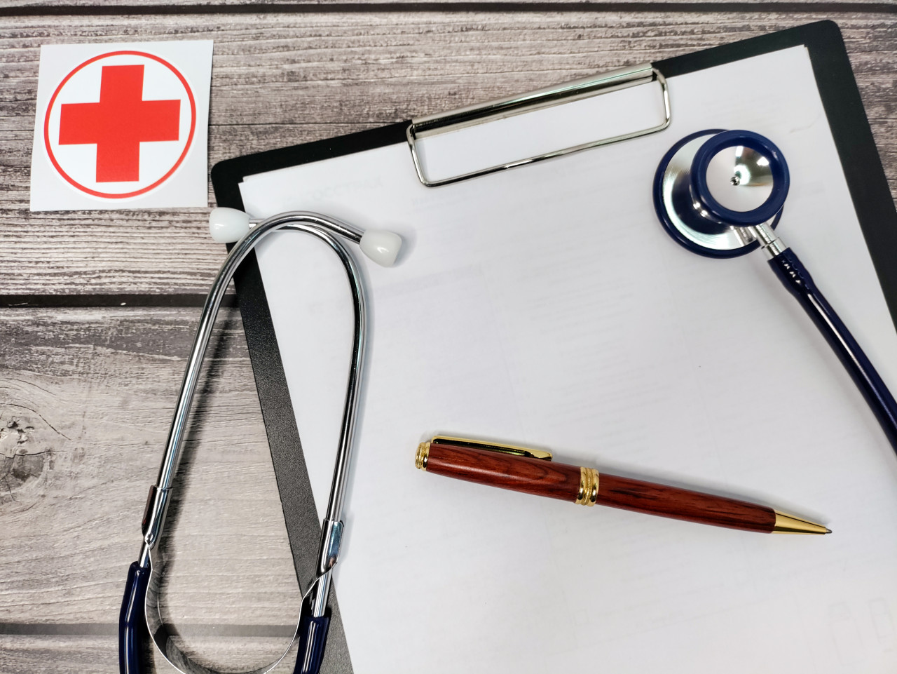 На фотографии показан стетоскоп тёмно-синего цвета и деревянная ручка с золотыми элементами, лежащие на белом медицинском бланке с красным крестом в верхней части. Предметы расположены на деревянной поверхности, создавая деловую композицию, символизирующую работу врача и процесс оформления медицинских документов. Снимок может использоваться для статей о медицине, диагностике, профилактике заболеваний и работе поликлиник.