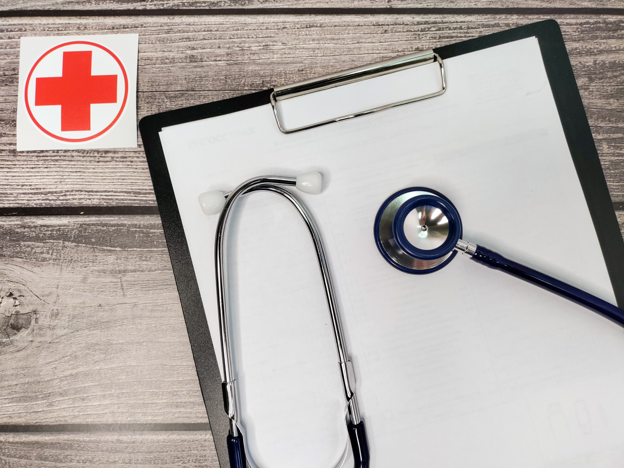 На фото изображён белый медицинский бланк на планшете с зажимом, лежащий на деревянной поверхности. В верхней части кадра расположен символ Красного Креста — международный знак медицинской помощи, признанный с 1864 года. На документе лежит тёмно-синий стетоскоп, используемый врачами для прослушивания дыхания и сердцебиения. Композиция выполнена в минималистичном стиле и может применяться для медицинских сайтов, образовательных материалов и публикаций о здравоохранении.