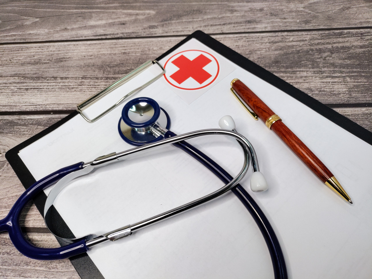 На фото показан стетоскоп с металлическими и синими элементами, лежащий на медицинском бланке на деревянной поверхности. В верхней части документа изображён красный крест — международный символ гуманитарной медицинской помощи, впервые использованный организацией «Красный Крест» в 1863 году. Рядом лежит деревянная шариковая ручка с золотыми вставками. Композиция символизирует врачебную работу и может использоваться для иллюстраций по теме медицины, диагностики и медицинской документации.