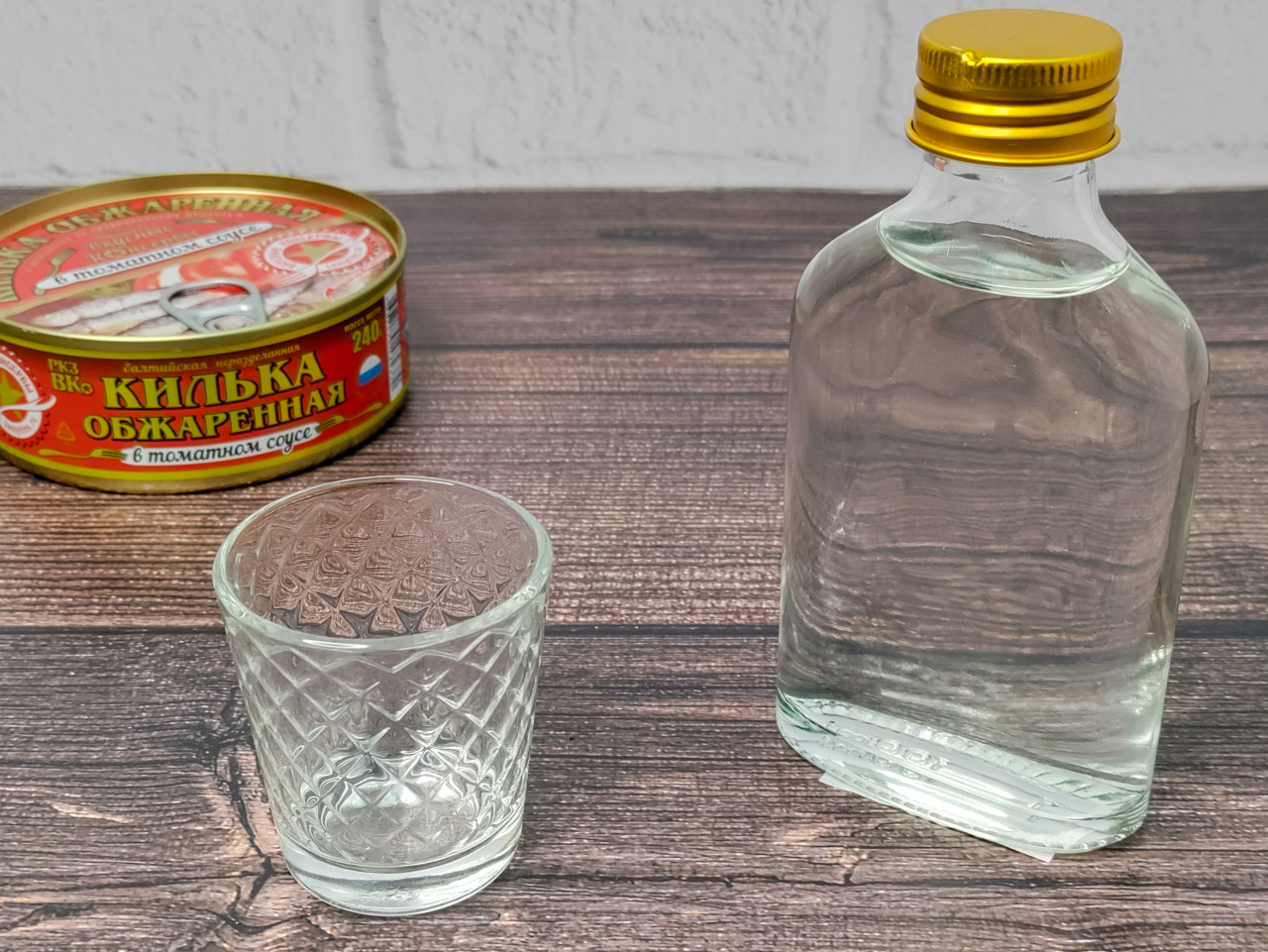 Стеклянная рюмка, бутылка и банка кильки в томатном соусе на деревянном столе