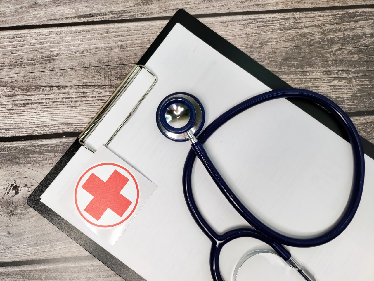 Фотография демонстрирует стетоскоп с синим шлангом, лежащий на белом листе, закреплённом в чёрном планшете. В углу находится яркий стикер с изображением красного креста, указывающий на медицинскую тематику сцены. Предметы размещены на деревянной поверхности с текстурой, напоминающей офисный или врачебный стол. Снимок подходит для иллюстраций к статьям о здравоохранении, медицинской документации, врачебной деятельности и образовательных материалах по медицине.