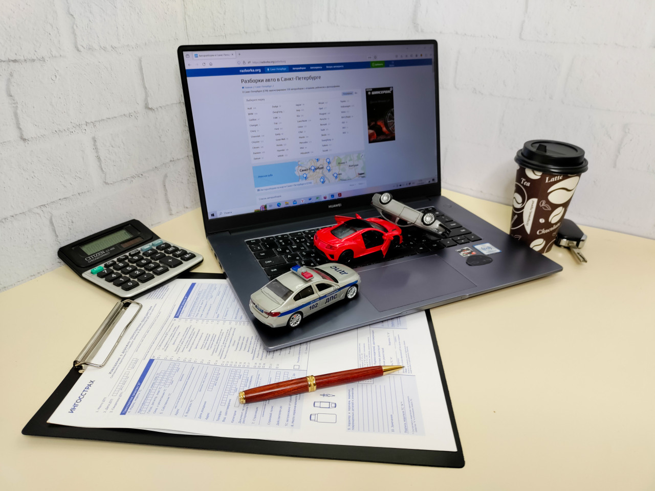 На фото изображено рабочее место с ноутбуком Huawei, на котором открыт сайт по поиску автозапчастей. На клавиатуре расположены три игрушечных автомобиля: полицейская, спортивная и легковая перевернутая модель. На столе лежат документы на планшете, ручка с золотыми деталями, калькулятор, стакан кофе и автоключ. Белая кирпичная стена служит фоном. Композиция символизирует анализ ДТП и оформление страховых случаев, подходит для иллюстраций по темам автострахования, оценок и технических экспертиз.