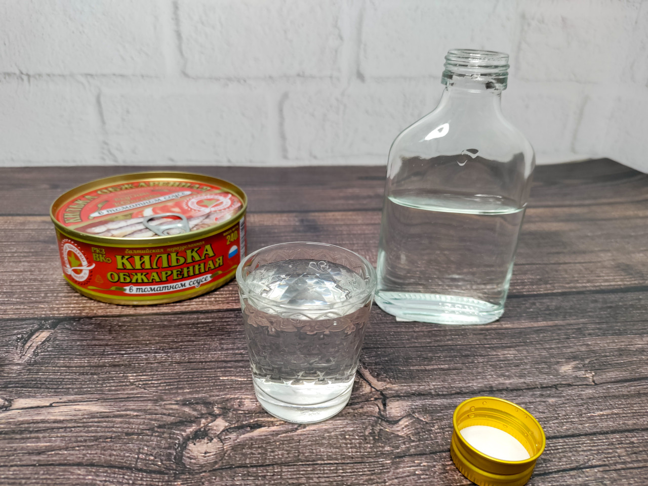Стеклянная рюмка, бутылка и банка кильки в томатном соусе на деревянном столе