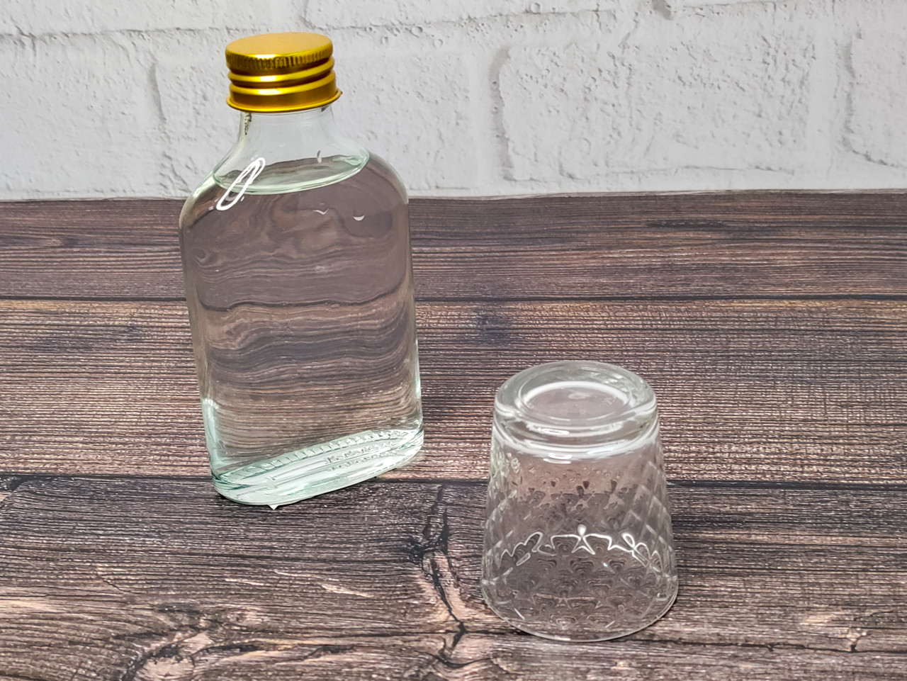 Полупустая бутылка и рюмка с прозрачным напитком на столе