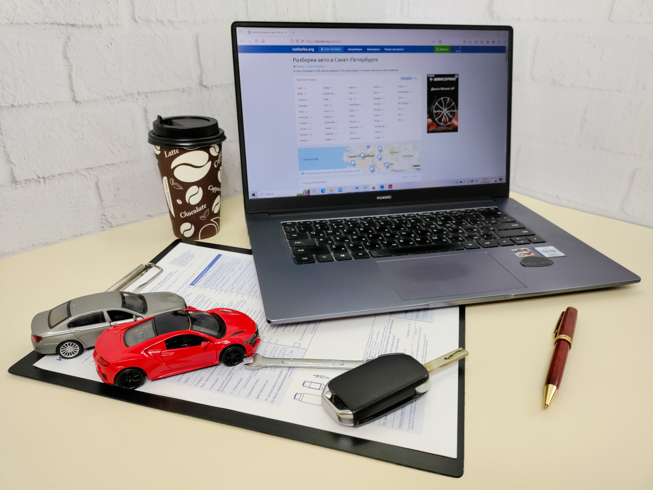 Ноутбук Huawei с сайтами авторазборок и игрушечными автомобилями