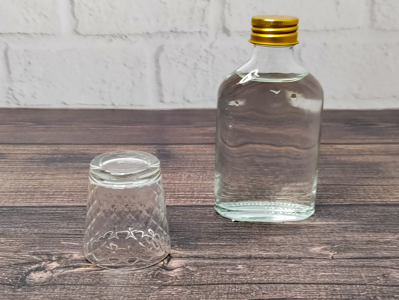 На снимке представлена прозрачная стеклянная бутылка с водкой и закрытой крышкой золотистого цвета, рядом — перевёрнутая рюмка с геометрическим узором. Объекты расположены на деревянной поверхности с выраженной структурой волокон. Сцена напоминает традиционное ожидание застолья и несёт символику умеренности и подготовки. Изображение подходит для публикаций о культуре пития, русских обычаях, советском наследии и этнографических темах.