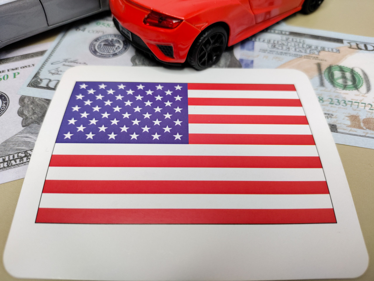 На снимке изображён прямоугольный флаг США, лежащий на поверхности среди банкнот номиналом 100 долларов США и красной модели автомобиля. Видны детали игрушечной машины и элементы дизайна долларов. Сцена символизирует американскую экономику, автомобили и валюту. Подходит для материалов о финансах, автопроме, экономике США или международных отношениях.