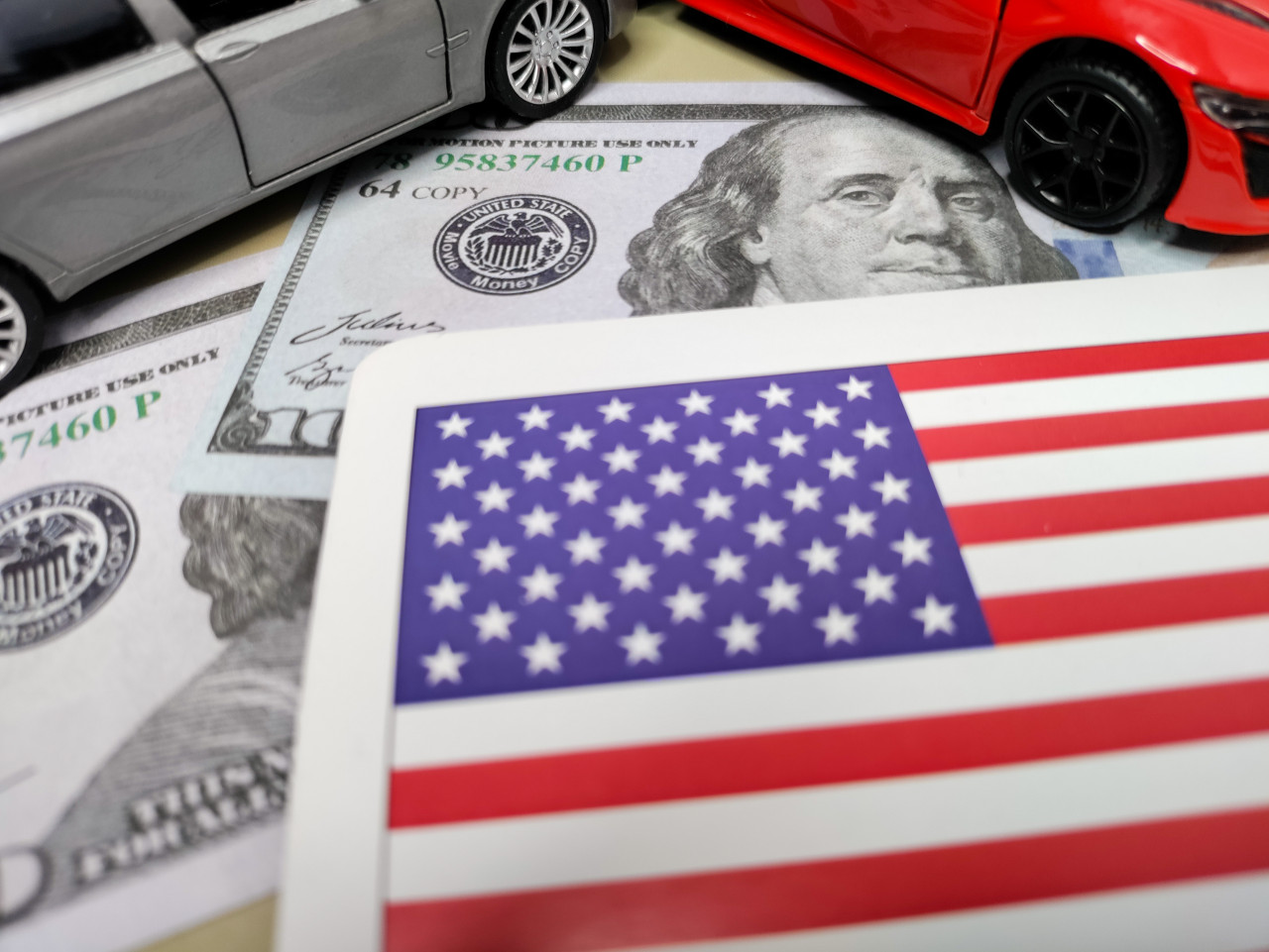 На изображении виден флаг США, расположенный на столе с купюрами номиналом 100 долларов. На заднем плане находятся миниатюрные модели автомобилей — серебристый и красный. На банкноте различим портрет Бенджамина Франклина, одного из отцов-основателей США. Снимок подходит для материалов о финансовых процессах, экономике и промышленности Соединённых Штатов.