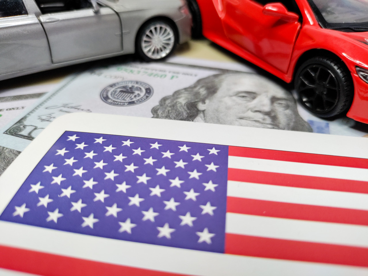 На фото изображён флаг США, частично накрывающий банкноты номиналом 100 долларов. На фоне видны миниатюрные автомобили — серебристый и красный, стоящие рядом. Композиция объединяет символику США, экономику и транспортную тематику. Снимок подходит для публикаций о финансовых рынках, автомобильной индустрии и международной торговле.