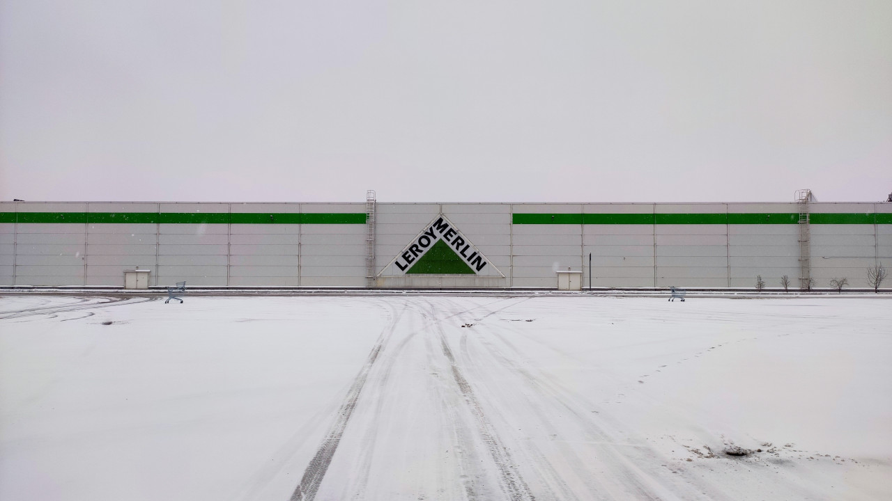 зима снег парковка торговый центр гипермаркет leroy merlin фасад логотип ритейл коммерческая недвижимость промышленная архитектура город инфраструктура уличная сцена Leroy Merlin магазин снегопад сезонность открытое пространство следы шин тележки холод коммерческий объект логистика Россия хозяйственный магазин торговая сеть метельПохожие фотографии