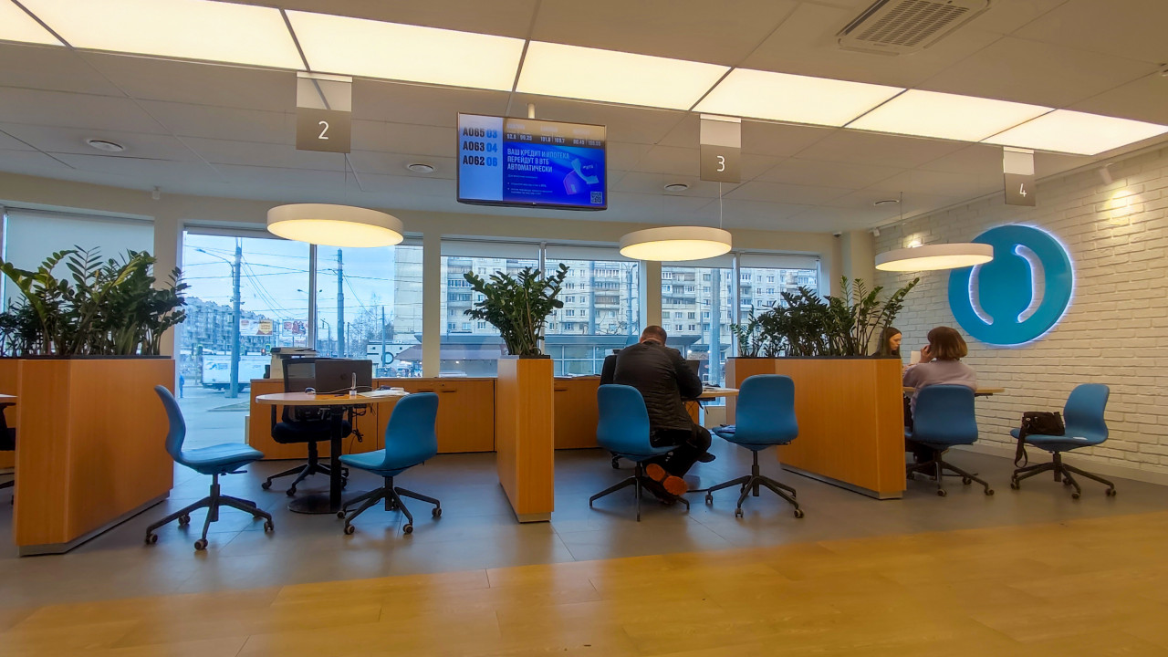 Рабочая зона офиса банка «Открытие» с номерами стоек обслуживания