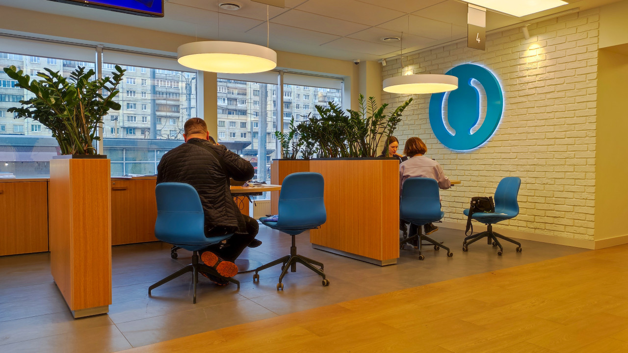 Интерьер офиса банка «Открытие» с клиентами за рабочими столами