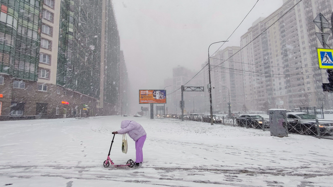 На снимке видно, как человек в светлой зимней одежде ведёт розовый самокат через заснеженную улицу во время сильной метели. На фоне расположены современные высотные жилые здания, автомобили на дороге, уличные опоры и крупный рекламный щит. Снежные хлопья заметно снижают видимость, что подчёркивает суровые погодные условия. Сцена характерна для российских мегаполисов в зимний период. Фотография подойдёт для материалов о погоде, городской среде, повседневности и транспорте.