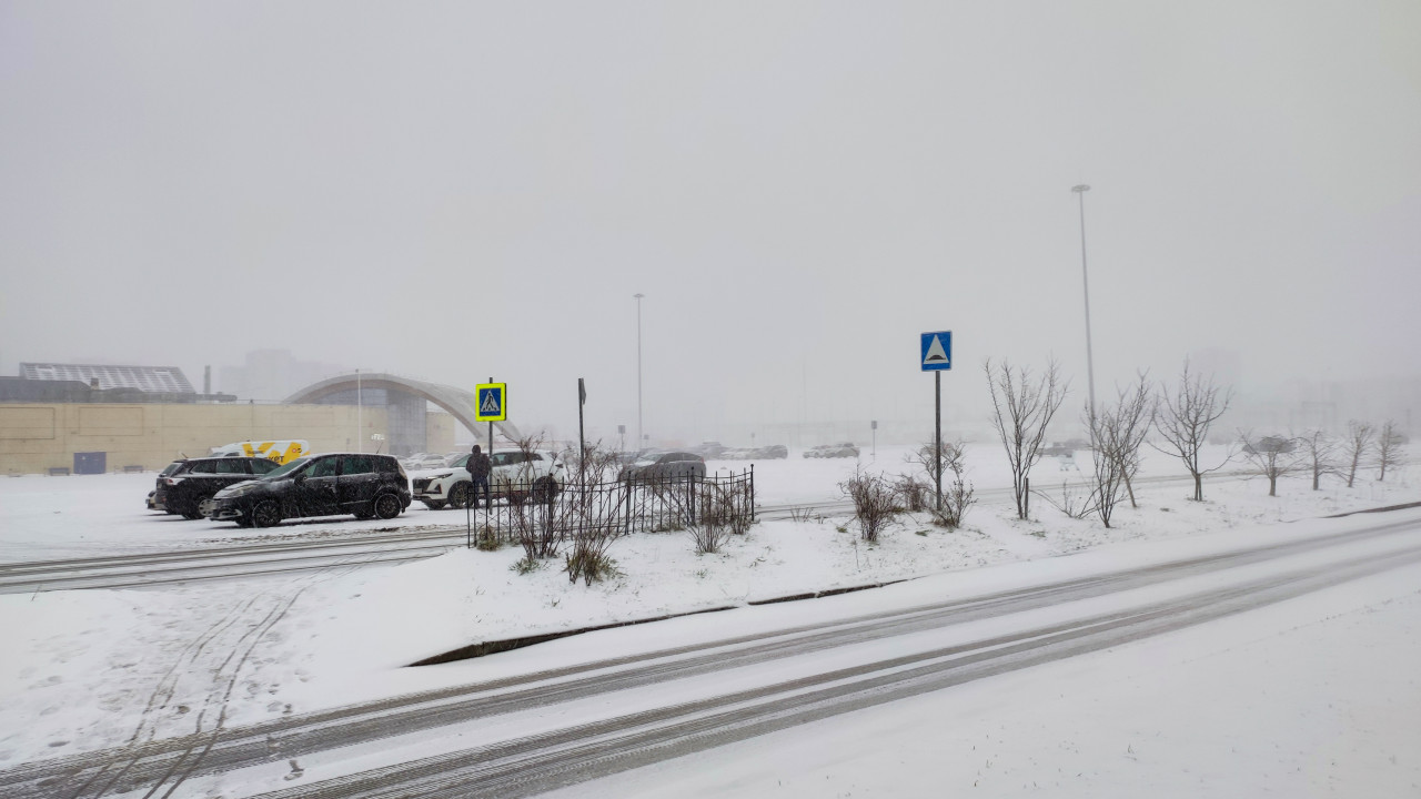 На фотографии запечатлена парковочная зона у торговых зданий, частично скрытых за плотной снежной пеленой. На переднем плане видны дорожные знаки пешеходного перехода, голые кусты, следы от автомобилей на заснеженной поверхности. Слева располагаются припаркованные машины, позади — большие коммерческие строения с арочным элементом крыши. Сцена отражает типичную зимнюю ситуацию возле крупных торговых центров в российских городах. Кадр пригоден для использования в статьях о погоде, транспорте и городской инфраструктуре.