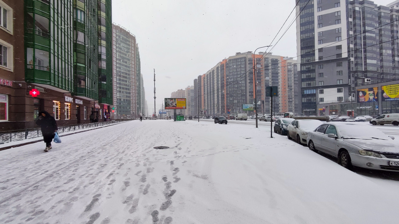 Фотография показывает заснеженную городскую улицу, где пешеходы движутся по тротуару, оставляя следы на свежем снегу. Слева расположен ряд современных жилых домов с коммерческими помещениями на первых этажах, справа — проезжая часть с припаркованными автомобилями. Вдалеке видны высокие жилые комплексы, рекламные щиты и элементы городской инфраструктуры. Снегопад создаёт равномерное рассеянное освещение. Кадр подходит для материалов о городской среде, погодных условиях, транспорте и повседневной жизни.