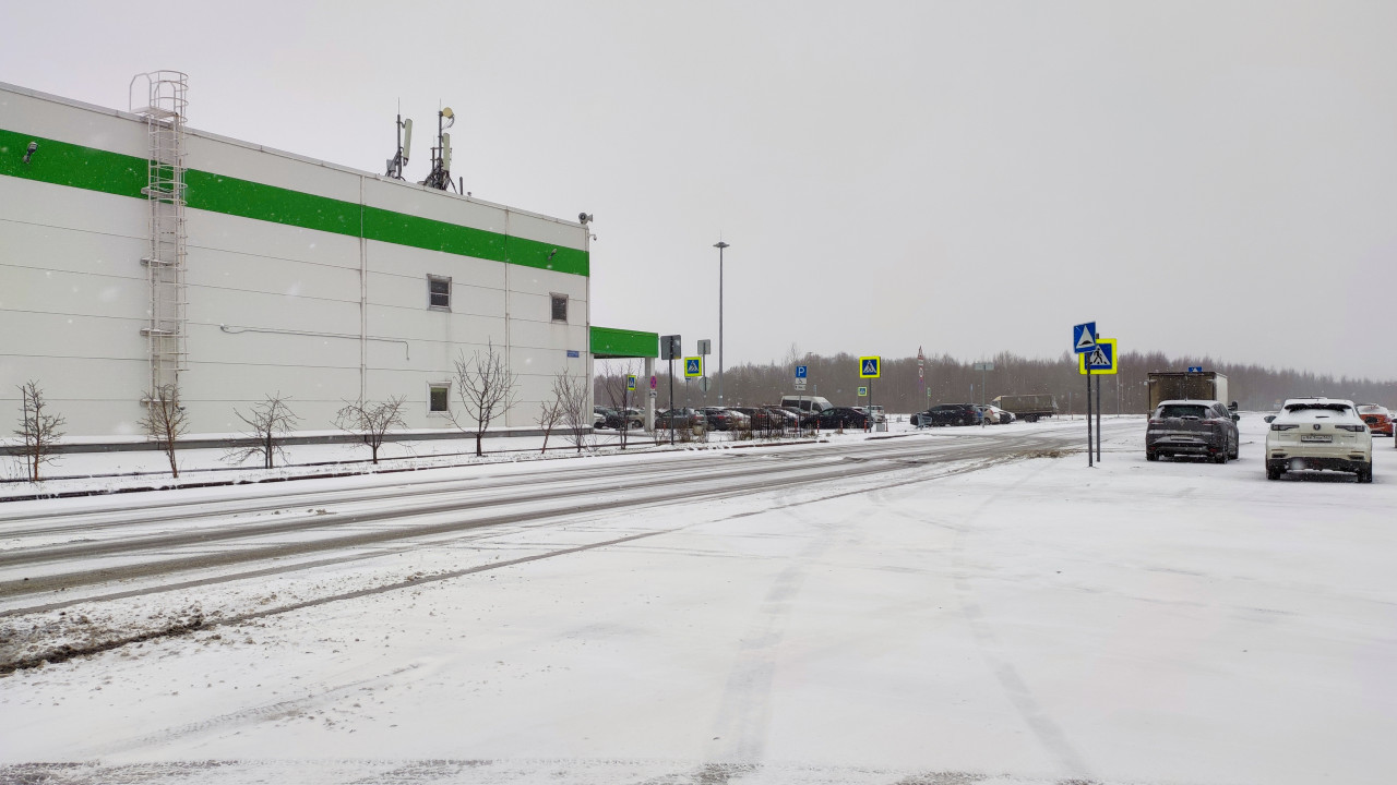 Зимняя дорога и парковка у здания Leroy Merlin