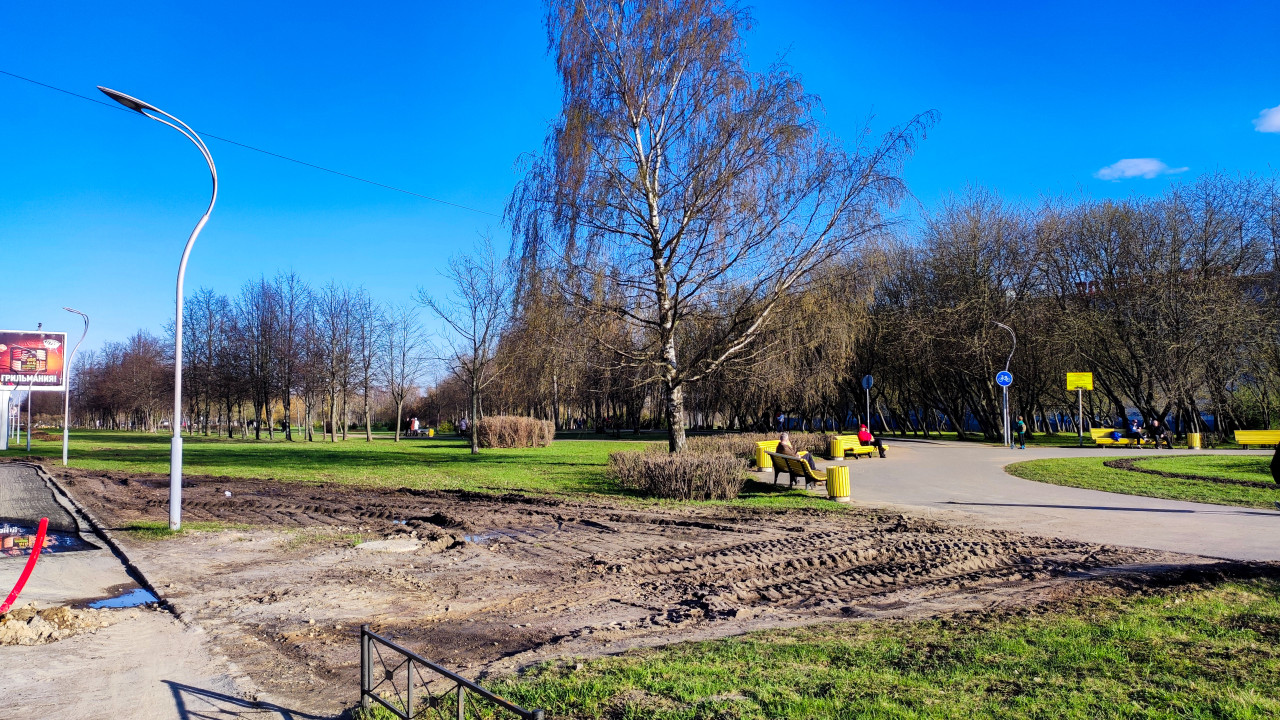 На фотографии изображён участок городского парка в ясный весенний день. В кадре видна пешеходная дорожка, окружённая зелёными газонами, деревьями без листвы и жёлтыми скамейками. На переднем плане — следы строительной техники и участок с грунтом, а также современные уличные фонари и рекламный щит. Снимок передаёт облик благоустроенного общественного пространства и подходит для использования в темах урбанистики, экологии и городского ландшафтного дизайна.
