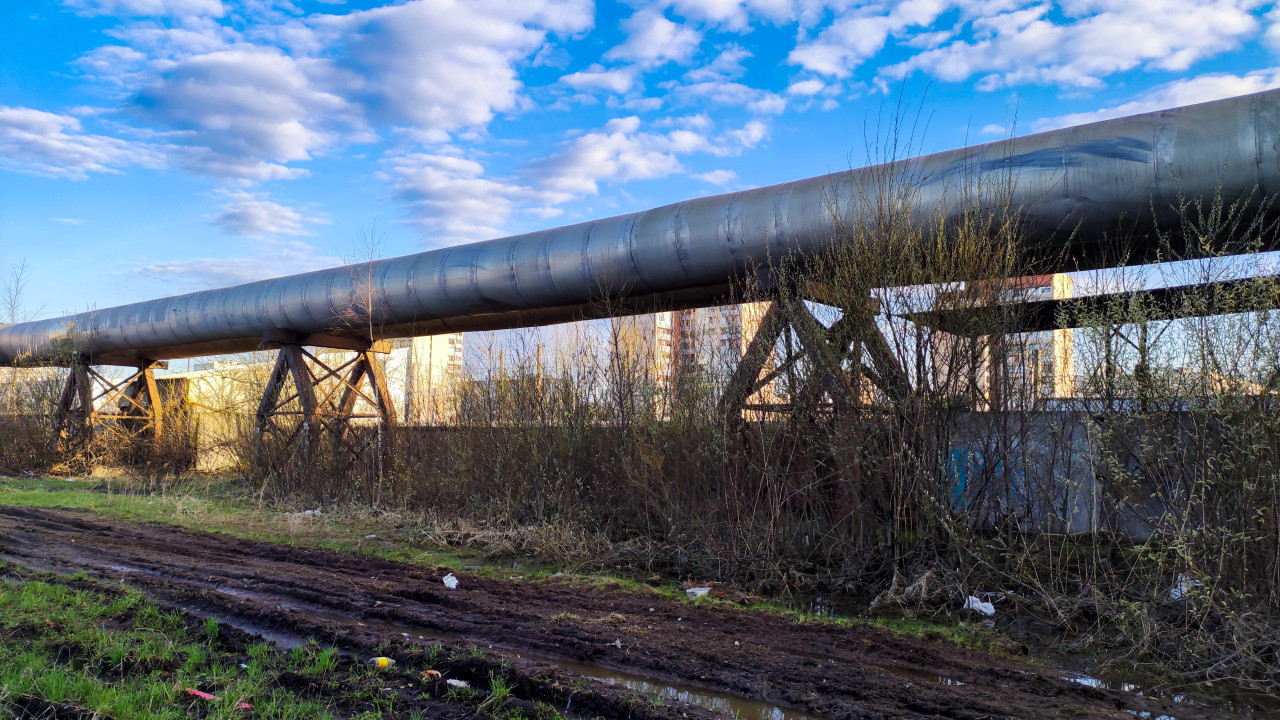 Воздушный трубопровод над землёй на фоне городской застройки
