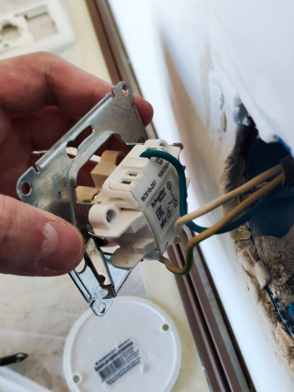 На фото запечатлён процесс установки электрической розетки: рука мастера удерживает элемент с проводами и заземлением. Видна металлическая монтажная пластина и пластиковая подрозеточная коробка в стене с отделкой под штукатурку. На заднем плане — крышка распределительной коробки с наклейкой. Сцена характерна для бытового ремонта и электромонтажных работ. Изображение может использоваться в материалах о строительстве, электрике и обучающих статьях.
