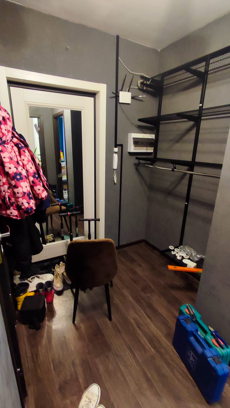 На фото показана прихожая современной квартиры с тёмным напольным покрытием, открытой металлической системой хранения, электрическим щитом на стене и проводкой, выведенной вдоль угла помещения. На полу расположены инструменты в чемоданах, пузырьковый уровень и крепёжные элементы, что указывает на процесс установки мебели или ремонтных работ. Слева видно зеркало в полный рост и одежда, размещённая на крючках. Снимок подходит для статей о ремонте, установке оборудования, организации пространства и быту.