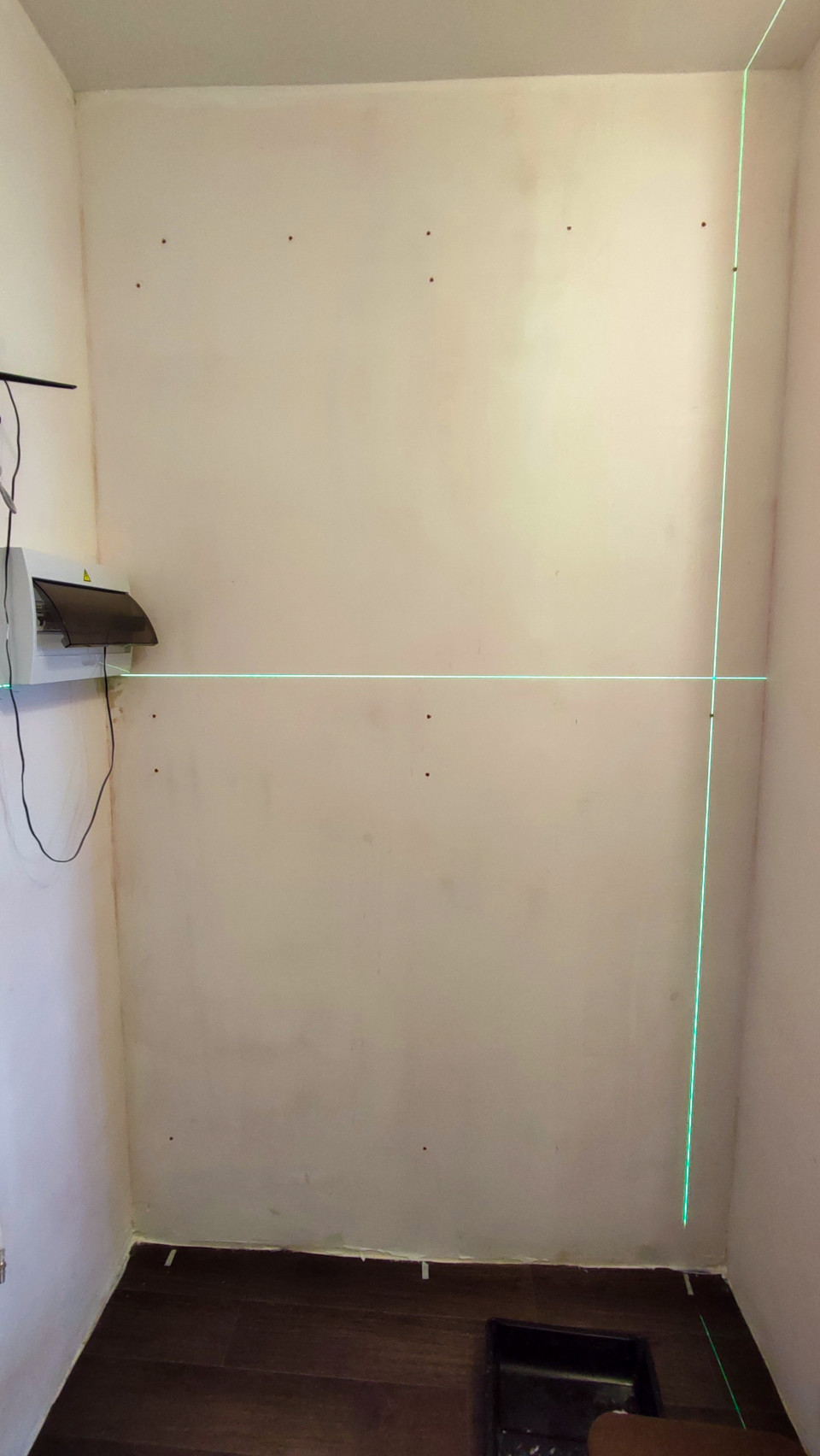 На фото показана стена в жилом помещении, на которой нанесена разметка лазерным уровнем: горизонтальная и вертикальная линии проходят по поверхности, помогая выровнять будущие элементы отделки. На стене заметны следы подготовки и отверстия от крепежей. Слева установлен электрический щиток с проводами. На полу видно тёмное напольное покрытие и угол малярного лотка. Снимок можно использовать в материалах о ремонте, строительных технологиях, подготовке помещений к отделке и использовании измерительного оборудования.