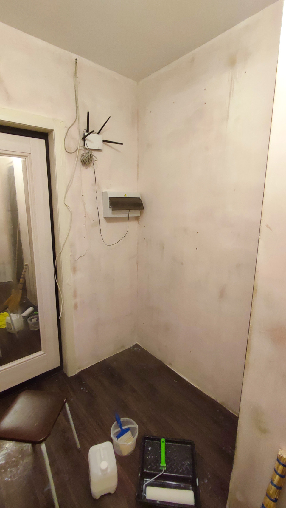 На снимке представлен угол жилого помещения во время ремонта: стены покрыты свежей шпаклёвкой, на полу разложены инструменты — лоток для краски с валиком, пластиковая канистра и ведро с кистью. На стене закреплён электрический щиток, рядом закреплён маршрутизатор с проводами. В отражении в двери видна часть соседнего помещения. Фотография подходит для иллюстраций о бытовом ремонте, подготовительных работах, обновлении интерьера и домашних проектах.