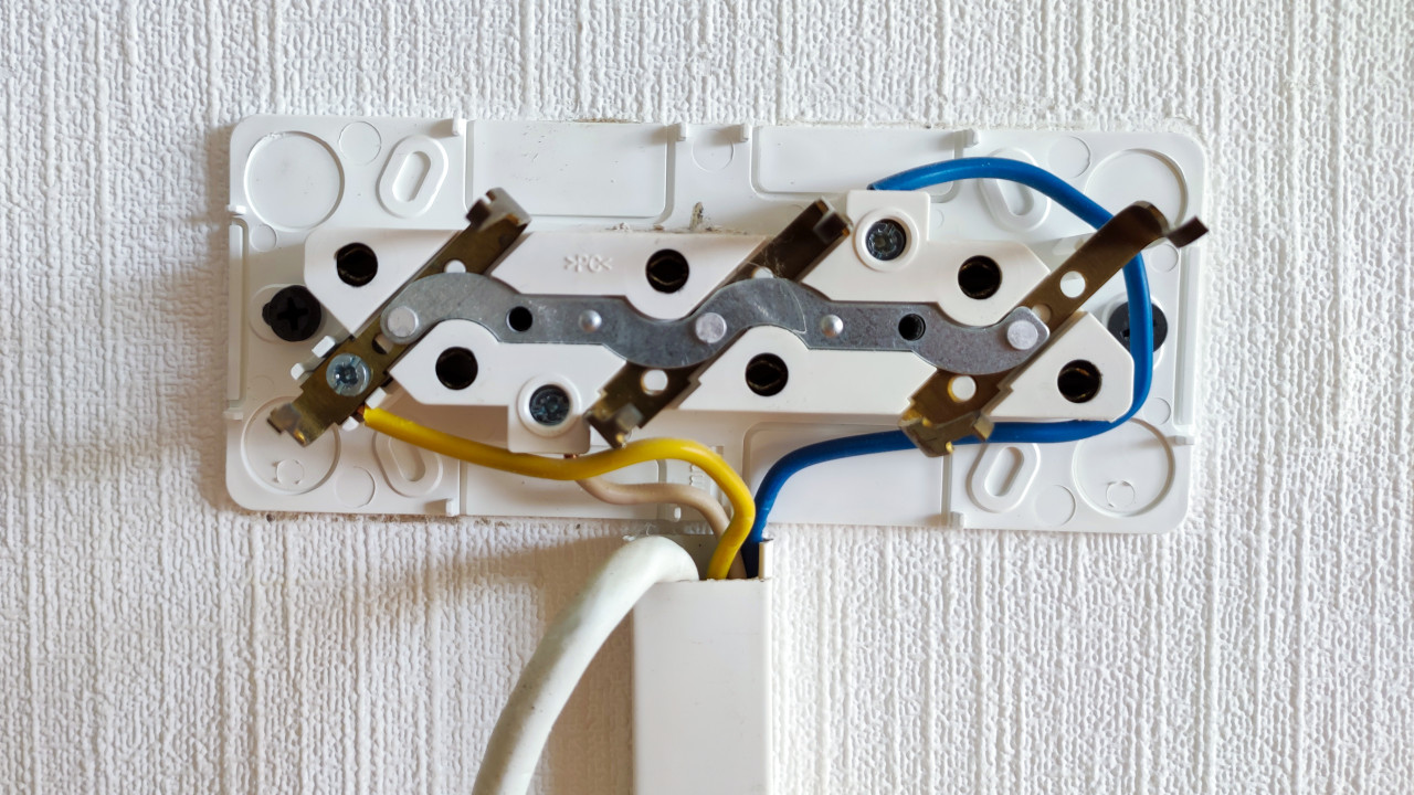 На фотографии изображён процесс электромонтажных работ: провода с изоляцией синего, жёлтого и белого цвета подключены к контактам розеточного блока. Устройство установлено на стене с фактурными обоями и закреплено металлическими элементами. Фото можно использовать в обучающих материалах по установке электрических розеток, соединению проводки и обеспечению электробезопасности.