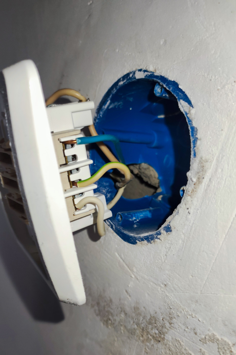 На фотографии изображена частично извлечённая из стены электрическая розетка с открытой внутренней проводкой. Видны контакты, подключённые проводники разных цветов, а также пластиковая монтажная коробка синего цвета, установленная в углубление стены. Поверхность стены имеет следы грязи и неровности. Сцена характерна для ремонтных или монтажных работ в бытовых помещениях. Фото подходит для статей об электромонтаже, безопасности, обучающих материалов по ремонту и иллюстрации технических инструкций.